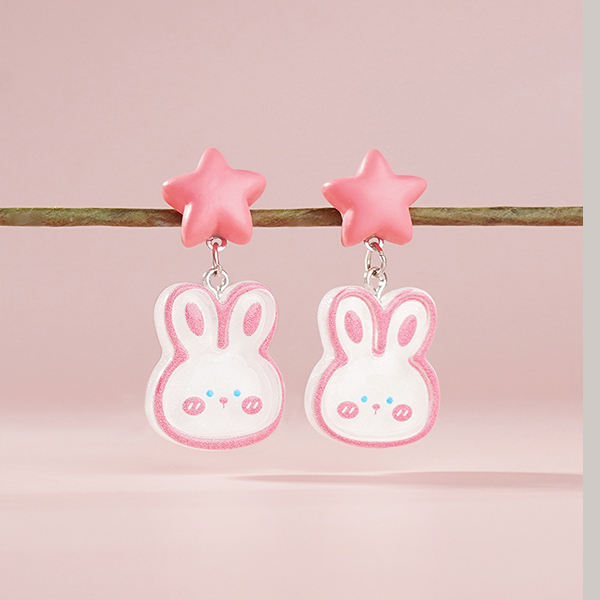 「夢幻小兔」無耳洞兒童黏貼式耳環以萌系兔兔造型搭配粉嫩星星耳釘,臉頰紅紅、表情呆萌療癒,宛如從童話世界蹦出來的小動物朋友。整體風格可愛討喜,是孩子日常穿搭與送禮的超人氣款。